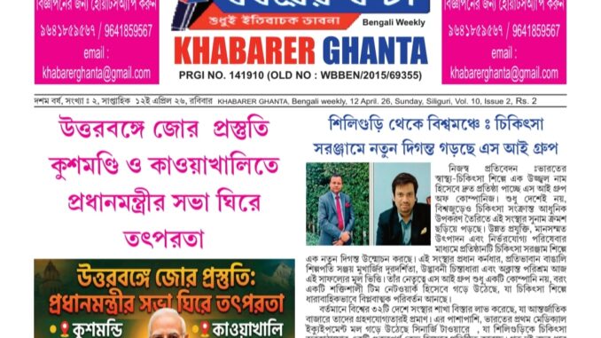 নিজস্ব প্রতিবেদন : গত ১২ এপ্রিল ২০২৬ তারিখে প্রকাশিত হয়েছে খবরের ঘন্টা সাপ্তাহিক পত্রিকার রঙিন ডিজিটাল সংস্করণ। নিচে 12-4-2026 অংশে ক্লিক করুন পত্রিকাটি পড়ার জন্য
