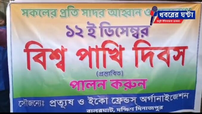 শুক্রবার, ১২ই ডিসেম্বর সকালে বালুরঘাট শহরে প্রত্যুষ ও ইকো ফ্রেন্ডস অর্গানাইজেশনের উদ্যোগ ও ব্যবস্থাপনায় প্রস্তাবিত বিশ্ব পাখি দিবস পালিত হল। বর্তমান বিশ্বায়নের যুগে ক্রমবর্ধমান পরিবেশ দূষণের প্রভাবে বহু প্রজাতির পাখি আজ বিলুপ্তির পথে।