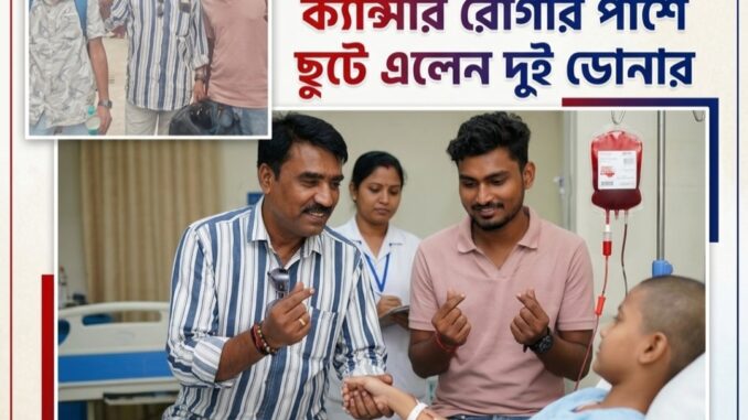 নিজস্ব প্রতিবেদক: মানবতার এক উজ্জ্বল দৃষ্টান্ত স্থাপিত হলো এনআরএস মেডিক্যাল কলেজ ও হাসপাতাল-এর ব্লাড ব্যাংকে। রক্তের তীব্র সংকটের মধ্যেও এক ক্যান্সার আক্রান্ত রোগীর জীবন বাঁচাতে এগিয়ে এলেন দুই স্বেচ্ছা রক্তদাতা।