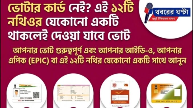 ভারতের নির্বাচন কমিশনের নির্দেশিকা অনুযায়ী, পরিচয় প্রমাণের জন্য আরও ১২টি বিকল্প নথি ব্যবহার করে আপনি আপনার ভোটাধিকার প্রয়োগ করতে পারবেন।