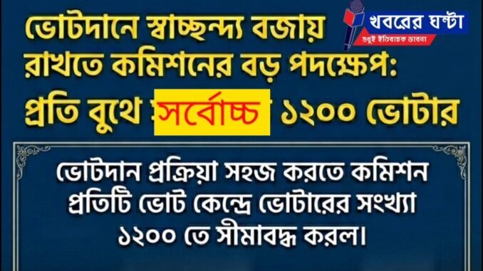 নিজস্ব প্রতিবেদন : এবারের বিধানসভা নির্বাচনে সাধারণ ভোটারদের ভোটদানের অভিজ্ঞতাকে আরও সহজ ও আরামদায়ক করতে বড় ঘোষণা করল ভারতের নির্বাচন কমিশন। ভোটকেন্দ্রে দীর্ঘ লাইন এবং ভিড় এড়াতে এবার প্রতিটি পোলিং স্টেশনে ভোটারের সংখ্যা নির্দিষ্ট করে দেওয়া হয়েছে। কমিশনের নির্দেশিকা অনুযায়ী, একটি বুথে ১২০০ জনের বেশি ভোটার থাকতে পারবেন না।