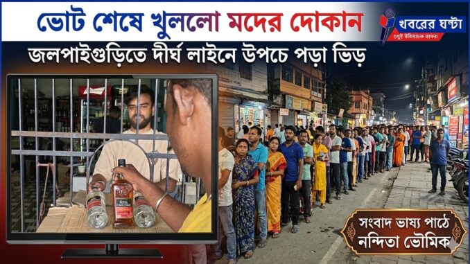 বিশেষ করে জলপাইগুড়ি শহর এবং আশপাশের এলাকাগুলিতে বিভিন্ন মদের দোকানের সামনে দীর্ঘ লাইন লক্ষ্য করা যায়। সকাল থেকেই ক্রেতাদের ভিড় ক্রমশ বাড়তে থাকে, যা দিনের বেশ কিছুটা সময় ধরে অব্যাহত ছিল। পরিস্থিতি নিয়ন্ত্রণে রাখতে কোথাও কোথাও শৃঙ্খলা বজায় রাখারও উদ্যোগ নিতে দেখা যায়।