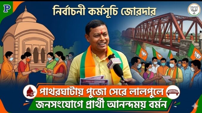 নির্বাচনী কর্মসূচি জোরদার, পাথরঘাটায় পুজো সেরে লালপুলে জনসংযোগে প্রার্থী আনন্দময় বর্মন