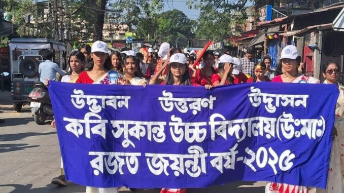 শিলিগুড়ি জংশন পাতিকলোনির কবি সুকান্ত হাই স্কুলে চলছে রজত জয়ন্তী বর্ষের বিশেষ উদযাপন। এই উপলক্ষে বিদ্যালয় প্রাঙ্গণজুড়ে তৈরি হয়েছে আনন্দঘন পরিবেশ। রজত জয়ন্তীকে স্মরণীয় করে তুলতে উদ্যোগ নেওয়া হয় এক বর্ণময় শোভাযাত্রার, যেখানে সকাল থেকেই শিক্ষক-শিক্ষিকা ও পড়ুয়াদের মধ্যে ছিল চোখে পড়ার মতো উদ্দীপনা।